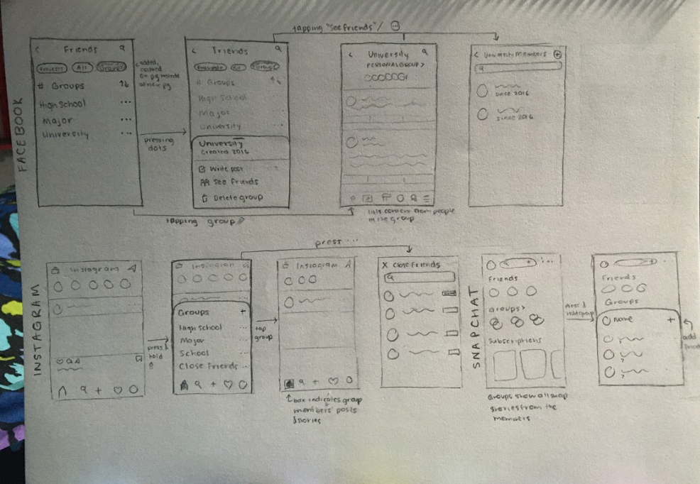 Users will be allowed to make multiple groups with different members, such as one for High School Friends and one for College Friends so that they can easily post and view content from their intended audience.