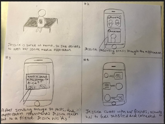 We conducted a usability tests with four participants to evaluate our wireframes. The inclusion criteria were that the participant had to be between 15-25 years old and have accessed either Facebook, Instagram, or Snapchat at least once in the past month.