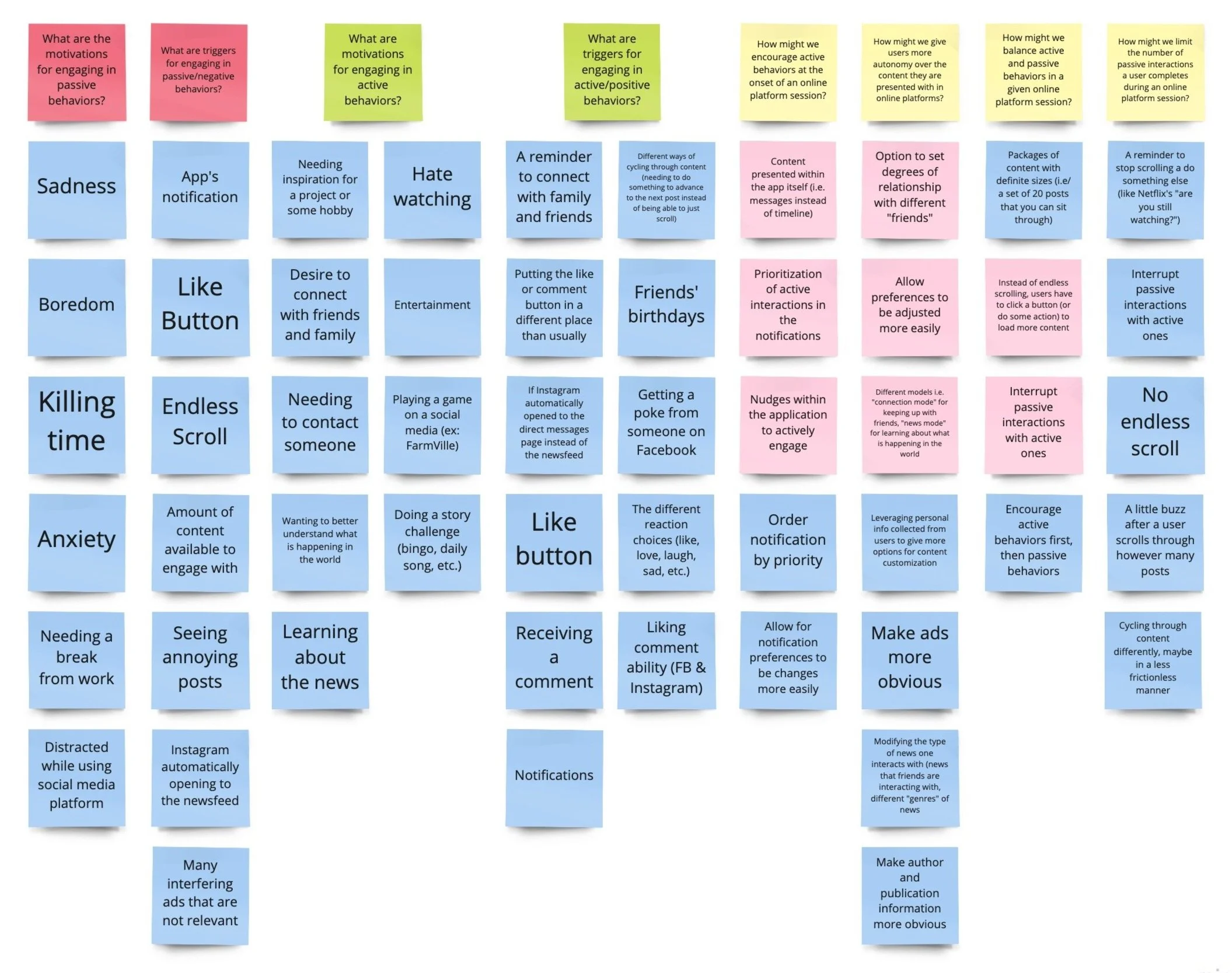 Our group analyzed peer-reviewed papers regarding this topic to better understand the problem space. We gathered insight into the psychological aspects of social media usage as well as design patterns for persuasive technology. We identified dark UX patterns and defined active social media usage as having direct exchanges with others.