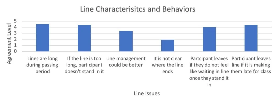This bar graph analyzes a rating question asking participants to rate how much they agree with statements about the HUB Starbucks lines. These statements were taken from the interview responses.