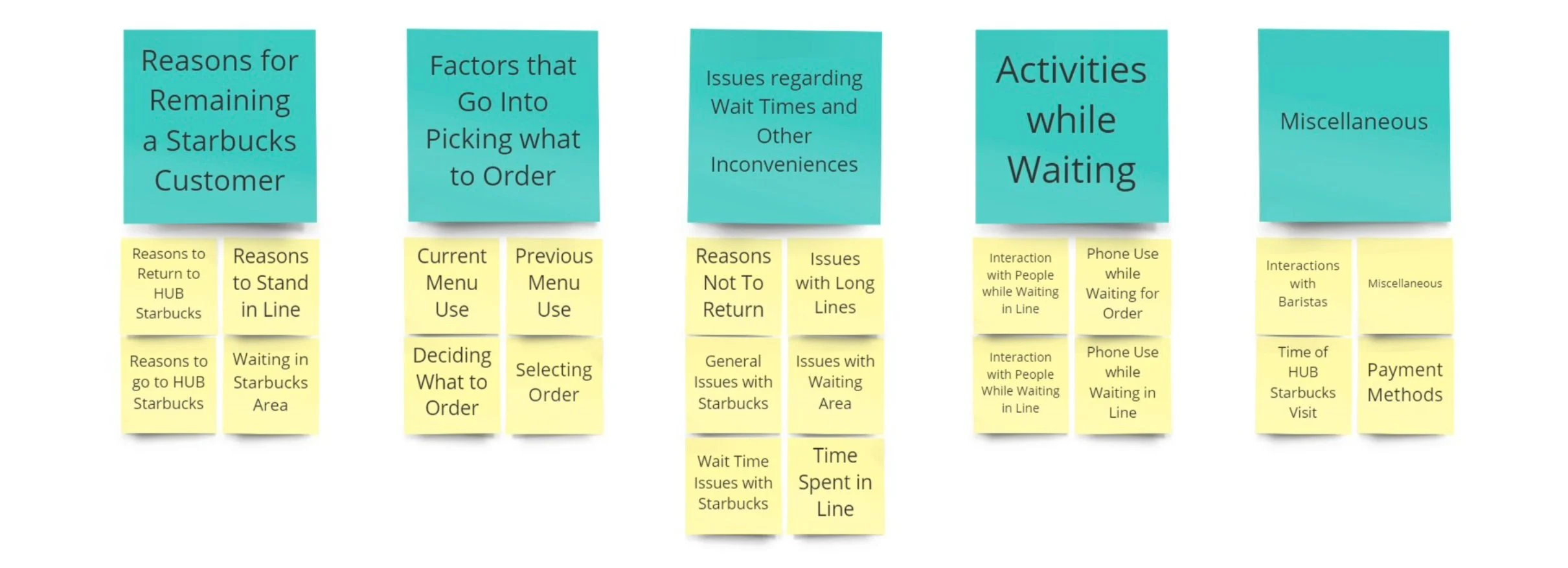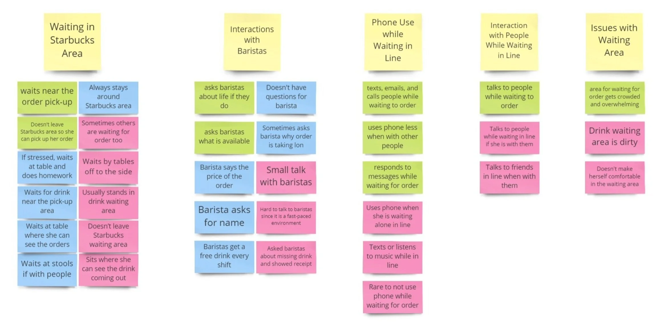 The purpose of the user interviews was to gain an understanding of the participants’ thought process behind ordering and waiting for their Starbucks order. I conducted 3 semi-structured user interviews with people who went to the HUB Starbucks at least once a quarter in the past year. All participants were undergraduate students. I analyzed the interviews using thematic analysis and affinity diagrams to find commonalities between the interviews.
